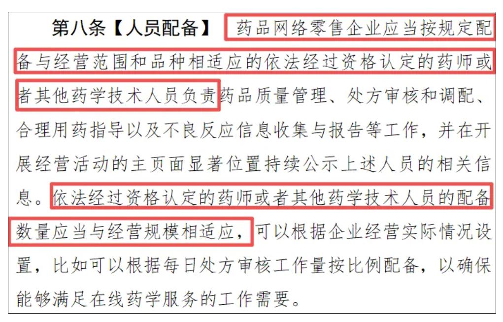 药品网络零售企业应当按规定配备与经营范围和品种相适应的依法经过资格认定的药师或者其他药学技术人员负责药品质量管理、处方审核和调配、合理用药指导以及不良反应信息收集与报告等工作。依法经过资格认定的药师或者其他药学技术人员的配备数量应当与经营规模相适应。