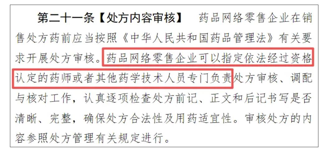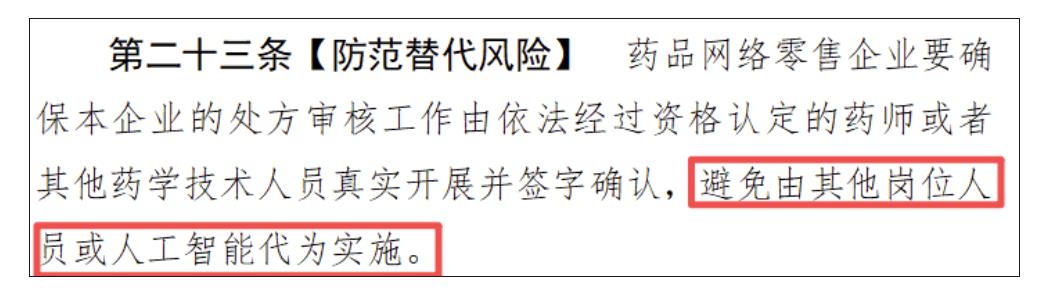药品网络零售企业要确保本企业的处方审核工作由依法经过资格认定的药师或者其他药学技术人员真实开展并签字确认,避免由其他岗位人员或人工智能代为实施。
