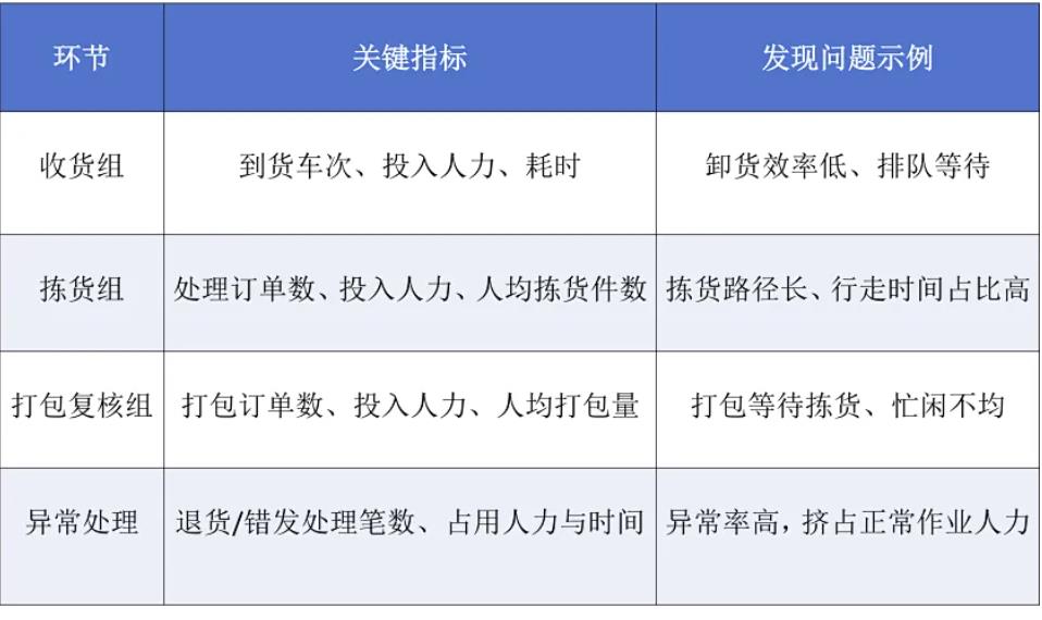 通过环节拆解,可像医生一样定位“病灶”——例如发现打包员经常闲置等拣货,即暴露了动线设计或流程衔接的问题。