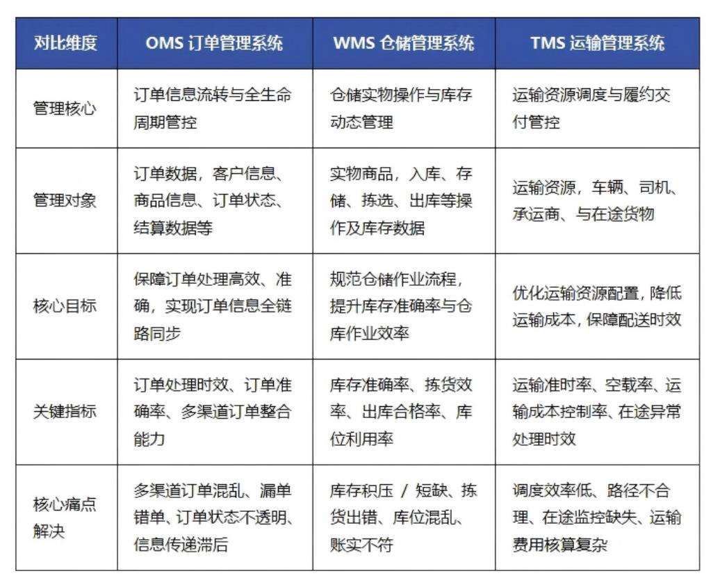 OMS、WMS、TMS虽同属物流数字化工具,但核心定位与功能边界清晰:OMS聚焦订单信息流转,是物流链路的信息中枢,WMS聚焦仓储实物操作,是订单落地的执行核心,TMS聚焦运输履约交付,是货物触达客户的保障核心。