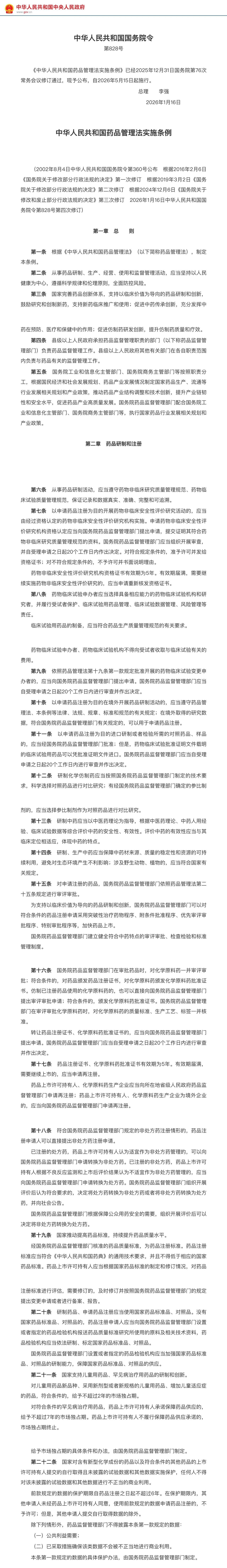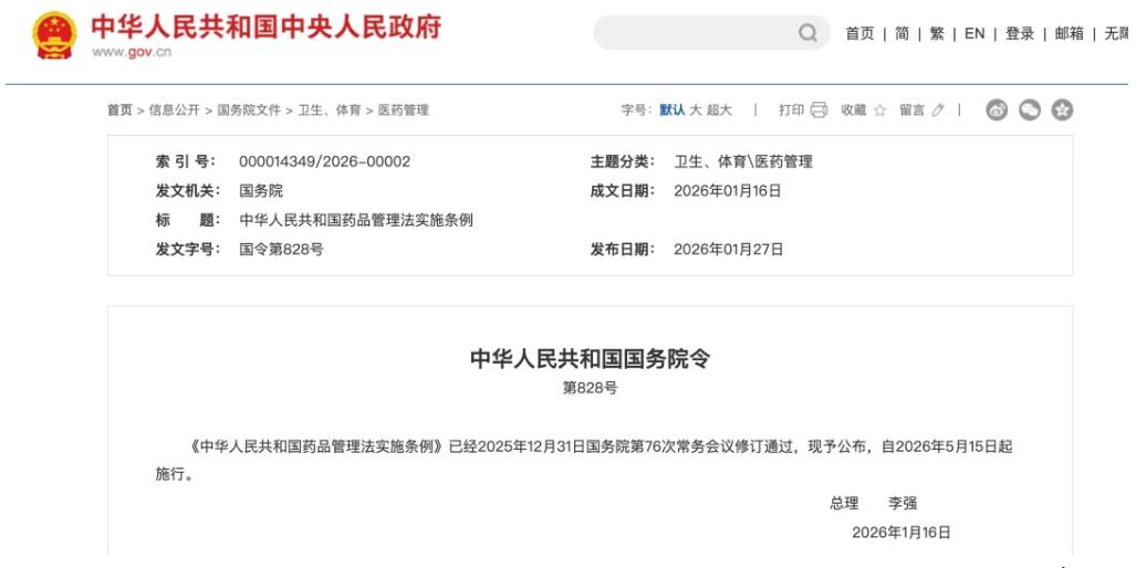 2026年1月27日,国务院令第828号公布第四次修订的《中华人民共和国药品管理法实施条例》,并明确于2026年5月15日正式施行。