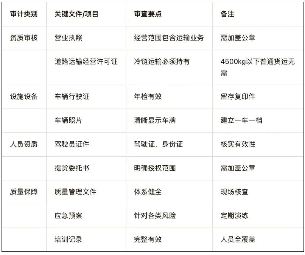 资质审核、设施设备、人员资质、质量保障能力这四大审计要点,是保障药品运输安全的关键防线。今天我们就来详细拆解每个环节的审查重点。