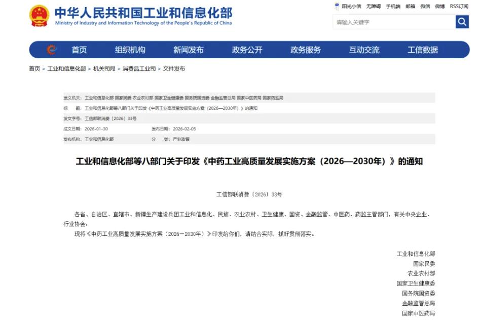 2026年2月5日,工业和信息化部等八部门发布《中药工业高质量发展实施方案(2026—2030年)》,为“十五五”时期中药工业高质量发展立标定向、领航赋能。