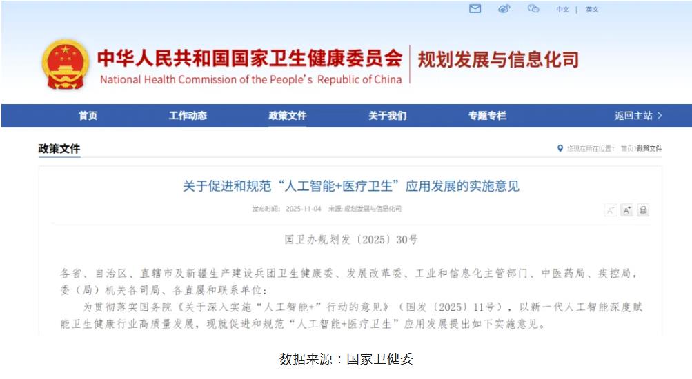 2025年11月4日,国家卫健委发布《关于促进和规范“人工智能+医疗卫生”应用发展的实施意见》,文件提出要加强中药全周期智能管理,鼓励中药研发机构和种植、生产企业构建中药材全流程追溯系统,探索道地药材种植数字孪生系统,实现生长全过程监测、指导及追溯,推动中药饮片炮制过程信息数字化采集、智能分析,实现中药种植、加工、使用的全流程智能管理。