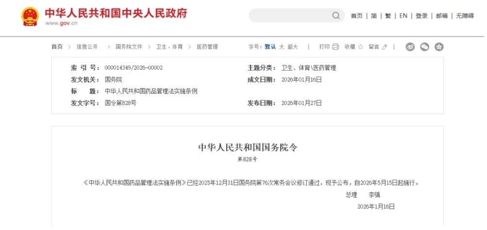 2026年1月27日,修订后的《中华人民共和国药品管理法实施条例》正式公布,并于2026年5月15日施行。《药品管理法实施条例》是《药品管理法》的重要配套行政法规,此次修订是条例施行23年来的首次全面修订,从以药品生产经营企业管理为中心转变为以药品上市许可持有人为中心,压实持有人主体责任,强化药品全生命周期严格监管,同时明确创新导向,助力医药产业创新发展。